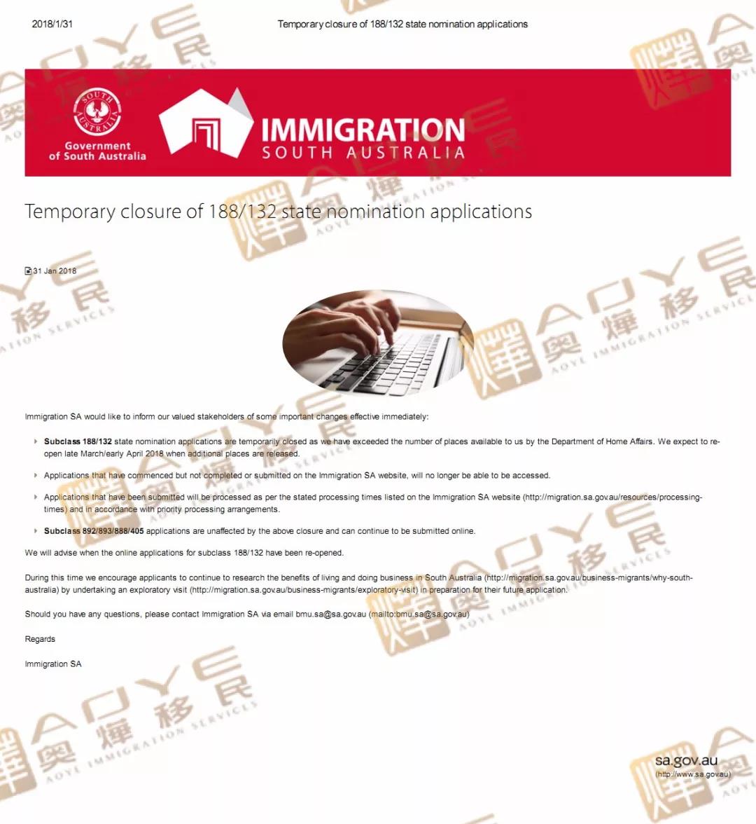 ·鉴于南澳移民申请者已超过移民局提供的申请席位,188/132签证州担保申请暂时关停。南澳移民局计划在2018年3月下旬或4月初申请席位释放后,重新开放申请。